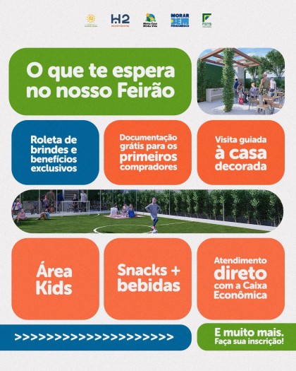 Dia 07 de junho você vai poder visitar a casa decorada, aproveitar a roleta de prêmios, curtir com a família na área kids e ainda ter atendimento direto com a Caixa Econômica Federal! Tudo isso com subsídio de até R$45 mil e possibilidade de entrada zero!